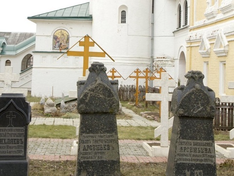 На территории монастыря есть маленькое кладбище в несколько могил. Стоят новые деревянные кресты и несколько старых интересных надгробных камней 19 века. Например, могилы Соловьевых. В середине 19 века Александр Петрович Соловьев, основатель шелковой промышленности в городе, занимался росписью приходских храмов.