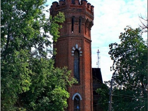 Особую эффектность главному дому придает западная восьмигранная башня, украшенная сверху поясом зубцов на машикулях (навесные бойницы, расположенные в верхней части крепостных стен и башен). Завершается башня шатром из поливной черепицы.