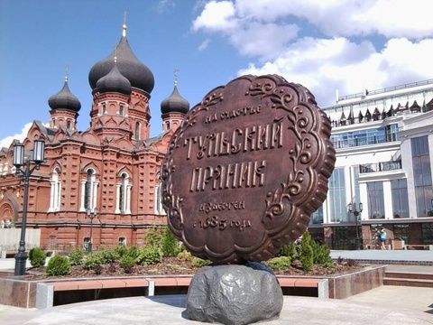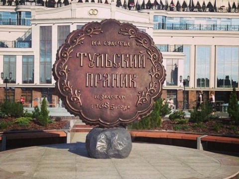 Наверное трудно было бы представить Тулу без памятника такому бренду как "Тульский пряник" :). Большой медный пряник поставили на главной площади города. Рядом красивый сквер с фонтанами, Дворец бракосочетания и Успенский кафедральный собор. На площади всегда много народу и туристов, фотографирующихся с пряником.