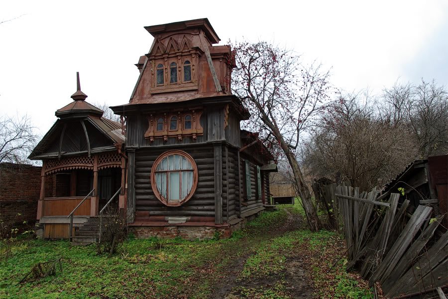 Красивый небольшой теремок, причудливых форм, является примером мастерства Кимрских зодчих. Еще один представитель симпатичного деревянного модерна на ряду с домом Лужиных. В первую очередь внимание привлекает необычная асимметричная крыша, круглое окно, похожее на иллюминатор, и конечно же резьба, украшающая дом.