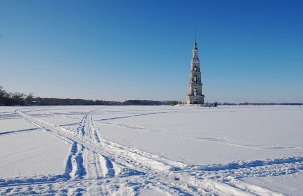 Одинокая колокольня стоит окруженная водой Углического водохранилища в районе устья реки Жабня. Завораживающие и необычные виды в любое время года. Смотреть и фотографировать удобно с улицы Карла Маркса, которая спускается прямо к воде (57.241627, 37.855398).