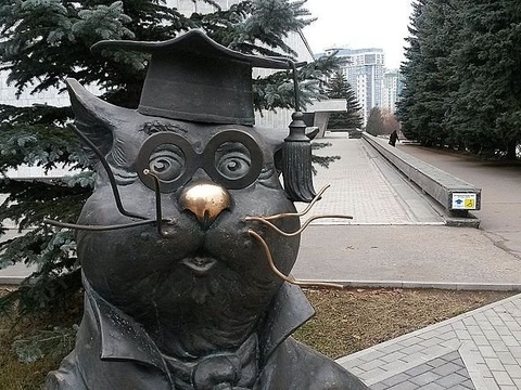 С книжкой и в очках, симпатичный бронзовый котик у Дома ученых.
