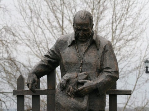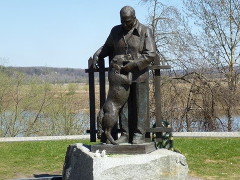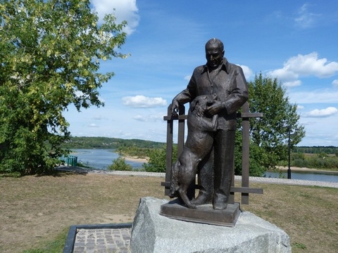 Живой, неформальный памятник. Хорошо смотрится на фоне Оки. Посвящен Константину Георгиевичу Паустовскому, советскому писателю, классику русской литературы. Паустовкий изображен с собакой у забора. Скорей всего это его любимая собака по кличке Грозный.