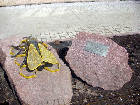 Памятник необычный и небольшой. Пчелка сидит на камне в клумбе, сразу можно и не заметить.