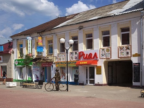 Калужский Арбат. Пешеходная улица с кафе и сувенирами. На ней расположен памятник Циолковскому с велосипедом.