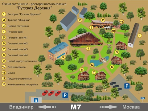 Отель Русская Деревня расположен при въезде во Владимир, в лесопарковой зоне. Имеет свою обширную зеленую территорию с прудом и граничит с самым большим городским парком "Дружба". Находится в 5 км. от исторического центра Владимира и в 25 км. от Суздаля.
