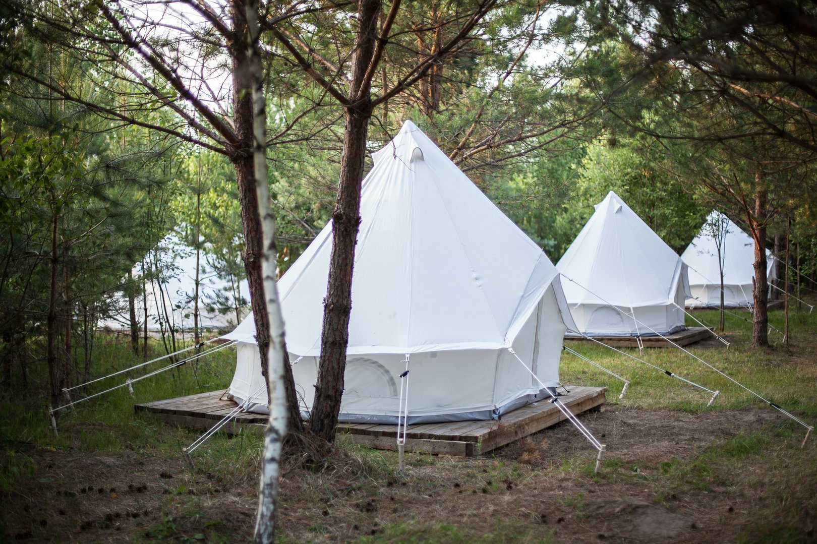 Большие палатки-шатры на деревянных подиумах. Внутри - надувные матрасы, подушки, постельное белье и полотенца. Кемпинг находится на берегу реки Угра и рядом с экспозицией арт-парка Никола-Ленивец.