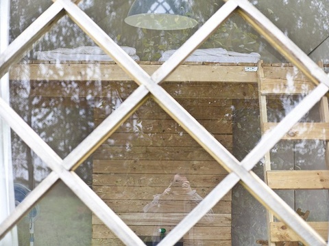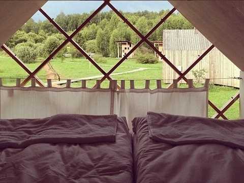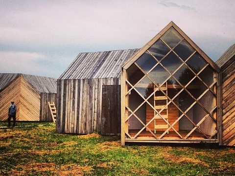 Домики построены из деревянного бруса по проекту архитектурной студии "Мел". Обшиты старой доской снаружи и белой фанерой внутри, утеплены. Спальное место на втором ярусе, одна стена - прозрачная. В домике могут уместиться от 2-х до 4-х людей.
